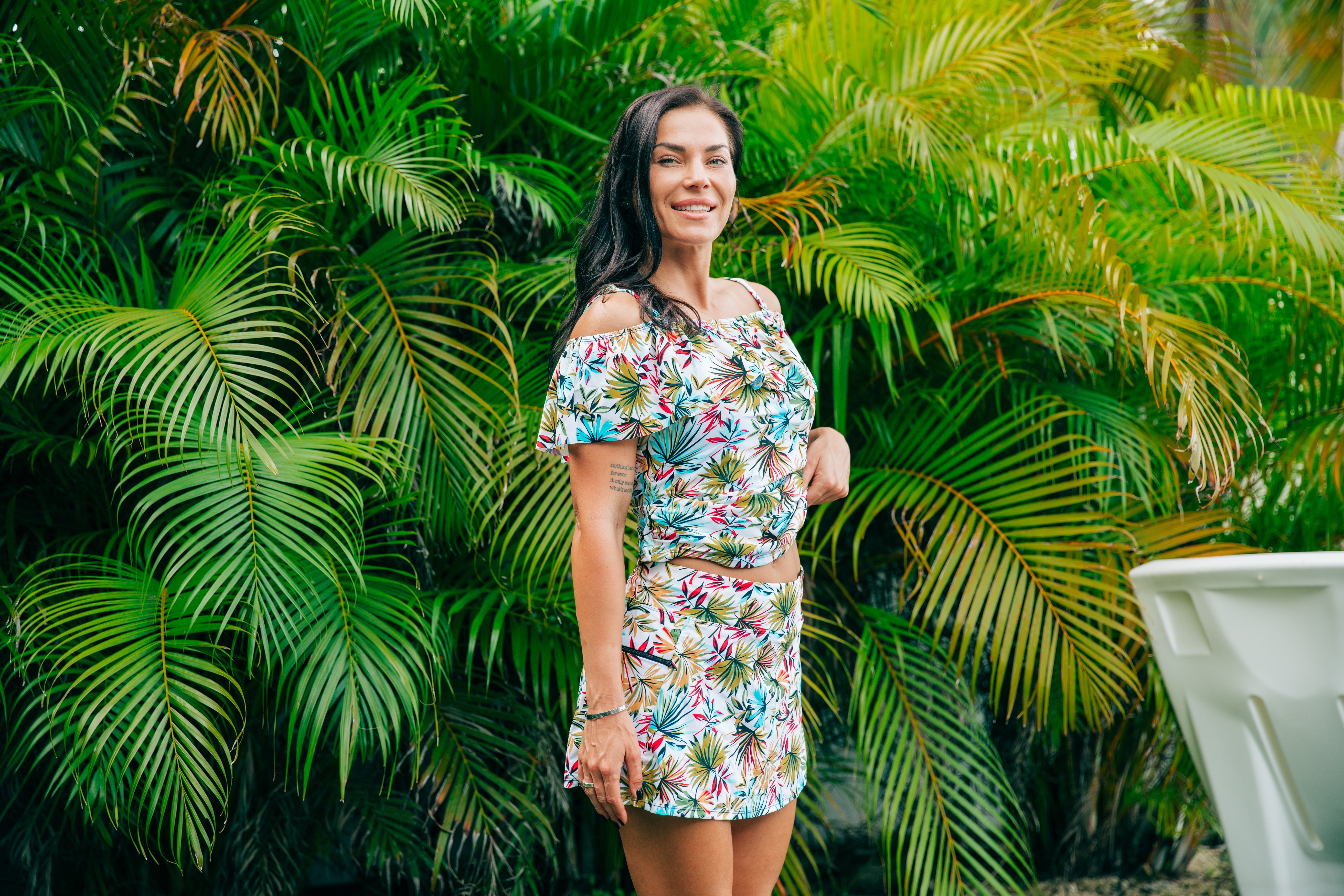 The off-the-shoulder ruffle tankini swimwear exudes a chic and playful vibe with its flattering, feminine design. The off-the-shoulder cut beautifully frames the collarbone and shoulders, offering a touch of elegance and style while providing the perfect amount of coverage. Soft, flowing ruffles along the neckline add a romantic, whimsical feel, enhancing the tankini's relaxed, beach-ready charm. The top is made from high-quality, stretchy fabric that moves with your body, offering both comfort and durability for swimming or lounging. With a comfortable, fitted design, this tankini provides just the right amount of coverage, while the adjustable straps allow for a customizable fit. Ideal for those who want a flattering and trendy alternative to traditional swimwear, the off-the-shoulder ruffle tankini combines modern style with feminine flair.