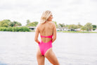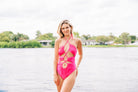 Elegant and playful, this one piece swimsuit features a halter style neck tie for a customizable fit. The sleek design offers a flattering silhouette, while the tie adds a touch of versatility and style.