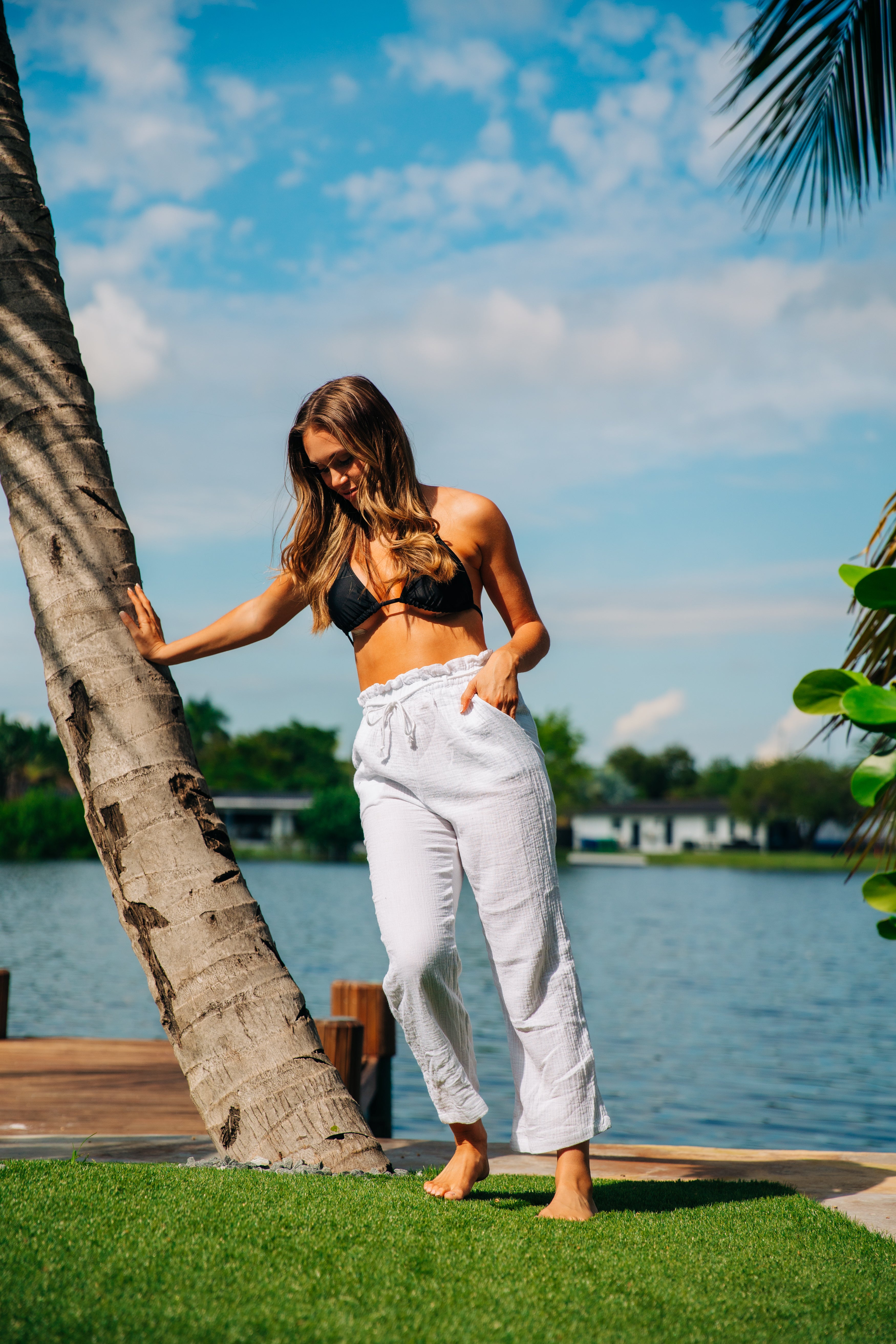 Elastic Waist Gauze Pants With Side Pockets - White